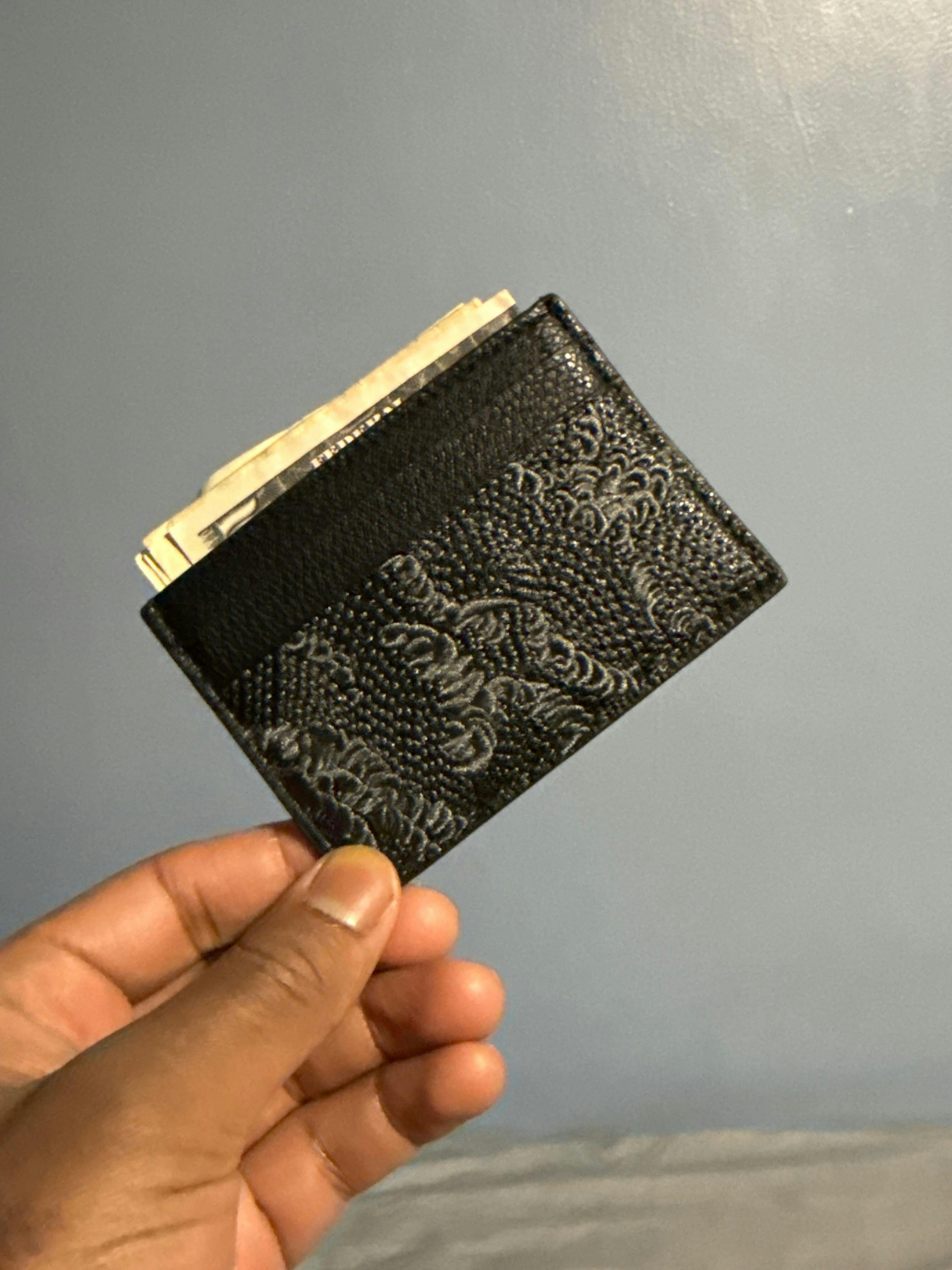 This cardholder makes a statement with its grained black leather and intricate black ‘Great Wave Off Kanagawa’ embroidery. Perfectly sized for any pocket, it keeps cards and essentials secure and organized with RFID-blocking technology. Sleek, compact, and built for daily use, it’s a bold yet practical essential.
