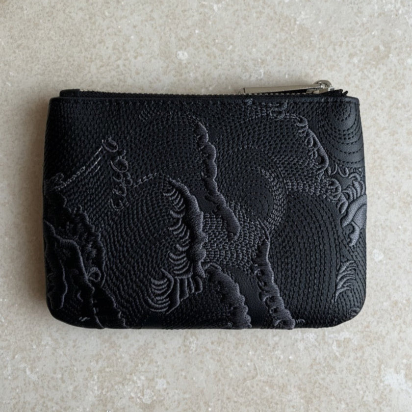 Elevate your essentials with a touch of art and functionality. Inspired by the iconic "Great Wave Off Kanagawa," our key pouch features delicate black embroidery on smooth, glossy leather.