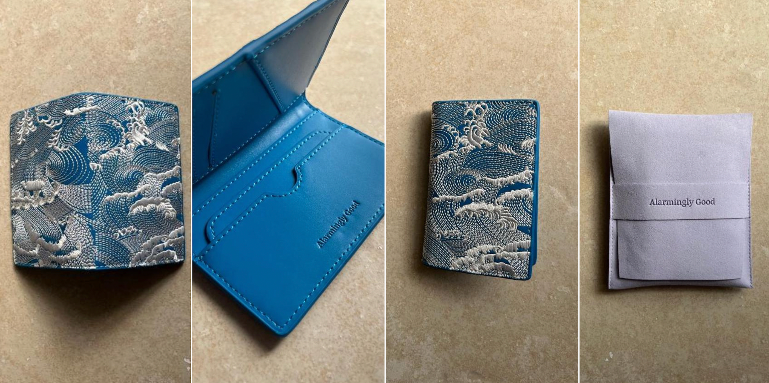 This bi-fold cardholder stands out with its striking white "Great Wave Off Kanagawa" embroidery on glossy blue leather. It fits effortlessly into any pocket, keeping cash, cards, and receipts secure with RFID-blocking technology. Simple to use and built to last, it’s a stylish upgrade for your essentials.