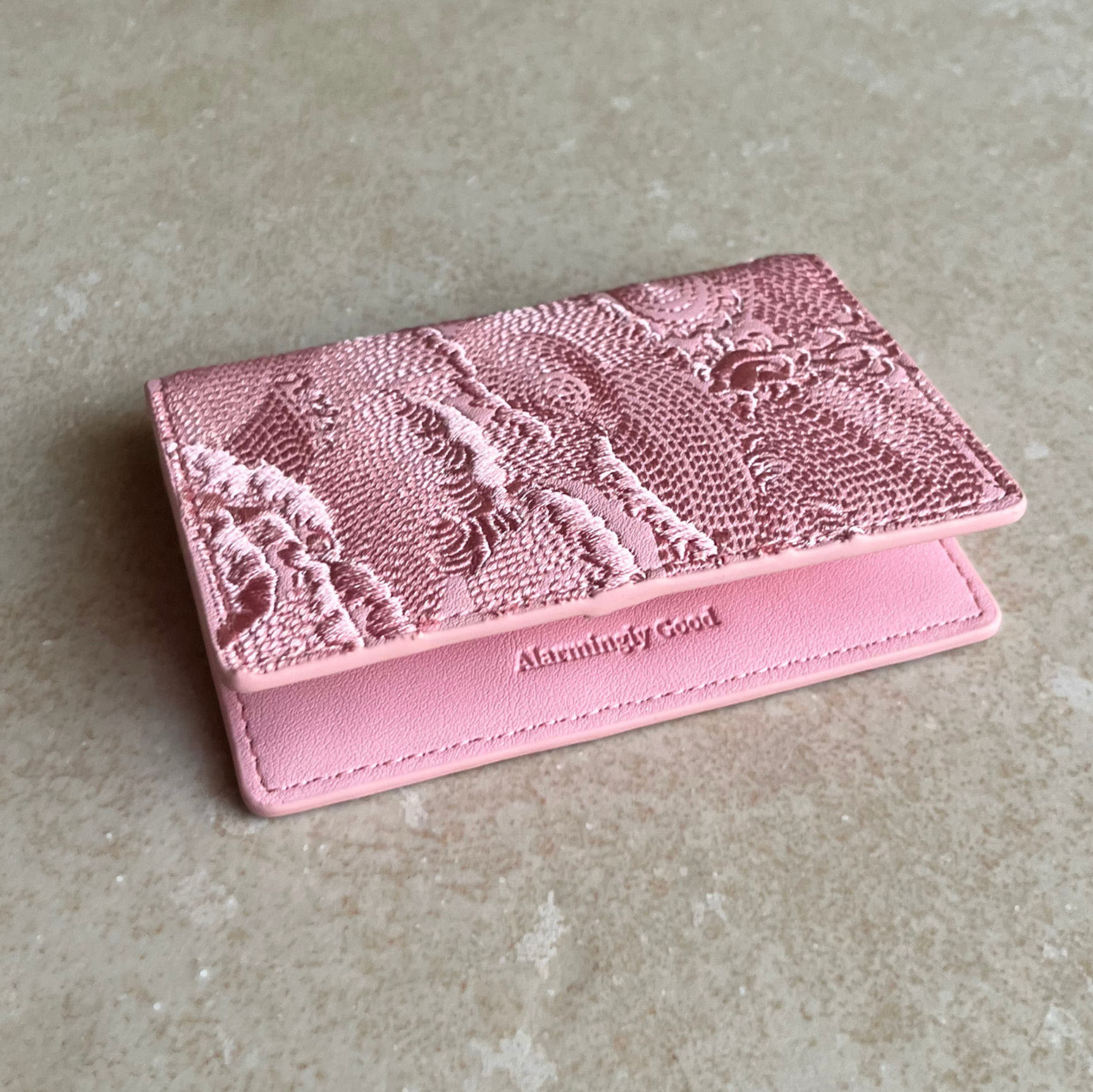 This bi-fold cardholder stands out with its sakura pink "Great Wave Off Kanagawa" embroidery on matte sakura pink leather. It fits effortlessly into any pocket, keeping cash, cards, and receipts secure with RFID-blocking technology. Simple to use and built to last, it’s a stylish upgrade for your essentials.